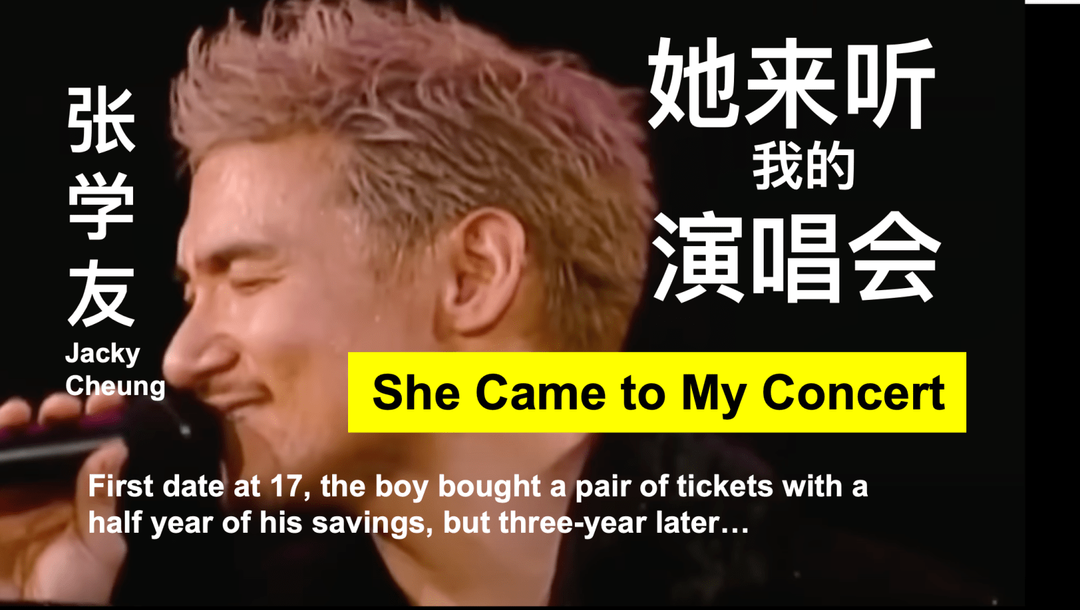 Learn Chinese through Songs 听歌学中文 Another amazing song by Jacky Cheung “She Came to My Concert.” 又一首难忘好听的张学友的歌《她来听我的演唱会》。The song tells a story of a female fan’s love life. It is another sad and sentimental song. Jacky Cheung tells the story perfectly with his amazing voice, making you want to listen to it again and again, as… Continue reading She Came to My Concert 《她来听我的演唱会》